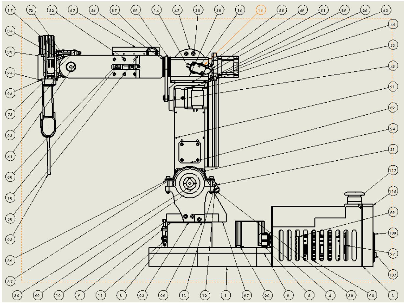 <table><tr><td>ITEM NO.</td><td>PART NUMBER</td><td>DESCRIPTION</td><td>QTY.</td></tr><tr><td>1</td><td>BASE SUB ASSEMBLY</td><td>M20 Bulkhead Assembly</td><td>1</td></tr><tr><td>2</td><td>MID SUB ASSEMBLY</td><td></td><td>1</td></tr><tr><td>3</td><td>GT2_16T_13x14 M1 REAL</td><td></td><td>1</td></tr><tr><td>4</td><td>ISO 7380 - M3 x 12 - 12N</td><td></td><td>6</td></tr><tr><td>5</td><td>MID REAL SUB ASSEMBLY</td><td></td><td>1</td></tr><tr><td>6</td><td>GT2_16T_13x14 M1 REAL 1</td><td></td><td>2</td></tr><tr><td>7</td><td>TOP REAR ASSEMBLY</td><td></td><td>1</td></tr><tr><td>8</td><td>TOP FRONT ASSEMBLY</td><td></td><td>1</td></tr><tr><td>9</td><td>linear nema 17 REAL</td><td></td><td>1</td></tr><tr><td>10</td><td>motor 5 adapter og REAL</td><td></td><td>1</td></tr><tr><td>11</td><td>ISO 4762 M2.5 x 16 - 16N</td><td></td><td>4</td></tr><tr><td>12</td><td>ISO 4762 M3 x 16 - 16N</td><td></td><td>1</td></tr><tr><td>13</td><td>ISO 4762 M2 x 20 - 16N</td><td></td><td>21</td></tr><tr><td>14</td><td>j3 gear 1</td><td></td><td>1</td></tr><tr><td>15</td><td>TOP END ASSEMBLY</td><td></td><td>1</td></tr><tr><td>16</td><td>Belt1-2</td><td></td><td>1</td></tr><tr><td>17</td><td>Belt2-3</td><td></td><td>1</td></tr><tr><td>18</td><td>Belt4-4</td><td></td><td>1</td></tr><tr><td>19</td><td>J5 bearing copy real</td><td></td><td>1</td></tr><tr><td>20</td><td>Belt7-3</td><td></td><td>1</td></tr><tr><td>31</td><td>j5 side plate1 cover</td><td></td><td>1</td></tr><tr><td>32</td><td>END EFFECTOR ASSEMBLY</td><td></td><td>1</td></tr><tr><td>33</td><td>ELECTRONICS</td><td></td><td>1</td></tr><tr><td>34</td><td>IEC320-C14 MAIN</td><td></td><td>1</td></tr><tr><td>35</td><td>ELECTRONICS ECLOSURE 1</td><td></td><td>1</td></tr><tr><td>36</td><td>Mega</td><td></td><td>1</td></tr><tr><td>37</td><td>E Stop Button</td><td></td><td>1</td></tr><tr><td>38</td><td>NF-A4x10 FLX</td><td></td><td>1</td></tr><tr><td>39</td><td>Timing pulley ISO 5294 Type L1</td><td></td><td>1</td></tr></table>