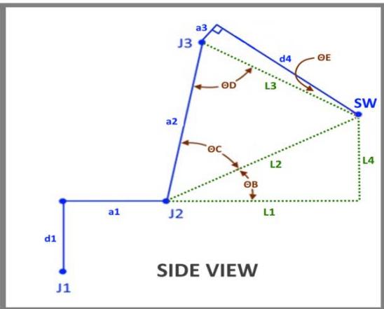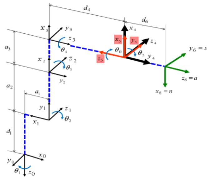 <table><tr><td>Joint</td><td>Θ</td><td>α</td><td>d</td><td>a</td></tr><tr><td>1</td><td>J1</td><td>-90</td><td>169.8</td><td>64.2</td></tr><tr><td>2</td><td>J1-90°</td><td>0</td><td>0.0</td><td>305.0</td></tr><tr><td>3</td><td>J2+90°</td><td>90</td><td>0.0</td><td>0.0</td></tr><tr><td>4</td><td>J3+180°</td><td>-90</td><td>222.6</td><td>0.0</td></tr><tr><td>5</td><td>J5</td><td>90</td><td>0.0</td><td>0.0</td></tr><tr><td>6</td><td>J6</td><td>0</td><td>36.3</td><td>0.0</td></tr></table>