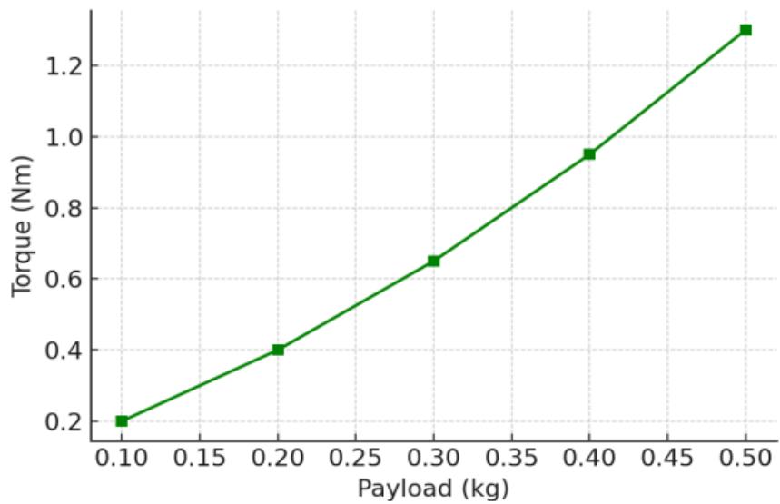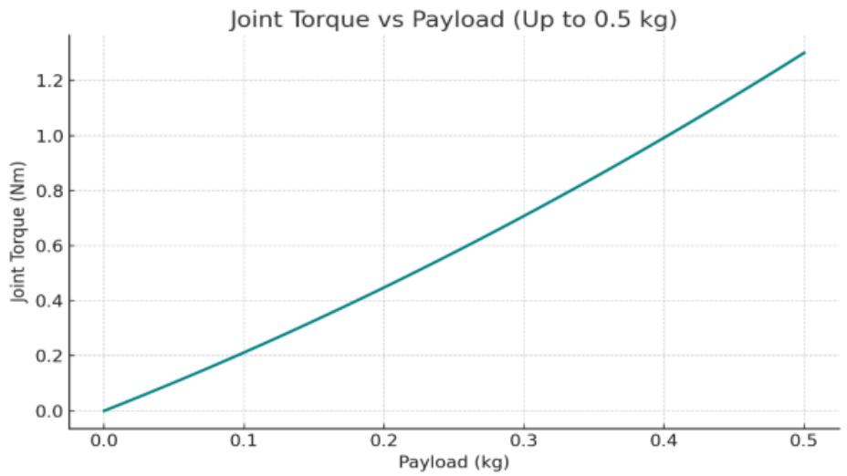 The second joint was subjected to incremental payloads to determine torque capacity. The system could handle up to $0.5\mathrm{kg}$ at full extension without significant motor slipping. However, due to the structural limitations of PLA, some flexing was observed at high loads, suggesting that future designs intended for industrial use should consider using more durable materials such as ABS or aluminum.