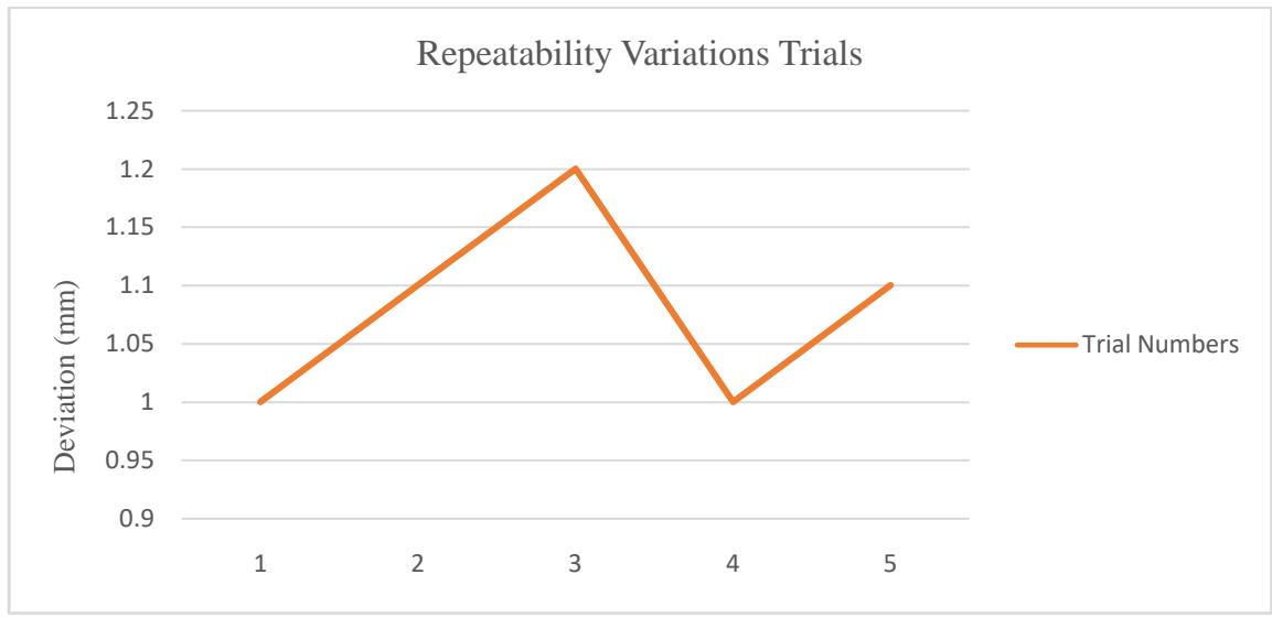 The robot achieved satisfactory positional accuracy for horizontal welding. Repeatability results suggest that the control system, though open loop, was sufficiently tuned. Mechanical accuracy was constrained slightly by PLA's flexibility, which may be addressed by reinforcing joint areas or using stiffer materials.