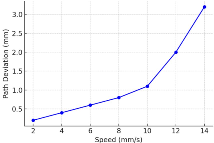 1. At speeds up to $10 \mathrm{~mm} / \mathrm{s}$, deviations remained under $1 \mathrm{~mm}$, indicating high accuracy.