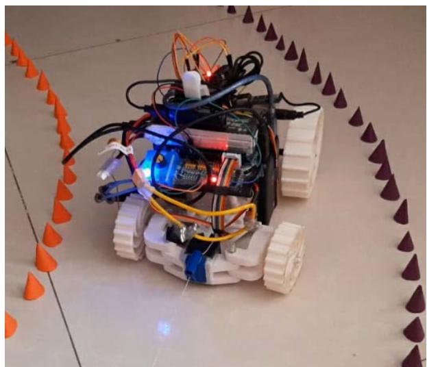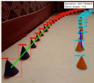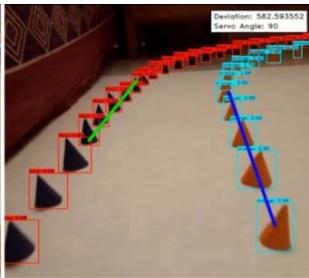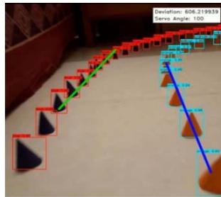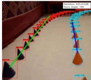 Deployment includes reading the coordinate text data generated from the YOIO4 model into a NumPy framework and labelling the coordinate points according to the two classes, blue and orange. This is done by iterating through the text data line by line, and appending the required point objects into a python array, and finally converting the array into a NumPy format. Matplotlib is used to visualize the set of data points from the camera's perspective, on a $10 \times 10$ cm2 adjusted screen. Using the Scikit-Learn Library, a Linear Regression model is trained using the NumPy data. Two different models are to be trained; one for the blue set of cones, and one for the orange. Using the 'Linear Regression()' predefined method in the Scikit-Learn library, we could easily create a simple regression model without having to build the entire code for the model ourselves. The data is zipped and iterated through using a for loop. The output generated is explicitly converted into a list format. Two lines are created that pass through the orange cones and the blue cones. Again, a graph is plotted of Matplotlib for visual aid of the lines. Next, the equations of the previously formed lines are derived using simple geometric calculations. Straight line equations of the type: $ax + by + c = 0$ are obtained for both blue and orange lines. Next, the point of intersection of the two lines is calculated using the formula of point of intersection. The offset of this line is calculated from the centre of the screen and the x-coordinate of each point is subtracted by the corresponding point on the centre of the screen. This value is the mean deviation and will be used further to calculate the angle by which servo attached on the assembly is to be turned. Fig. 1 shows the outcome of the entire video capture and path mapping process.