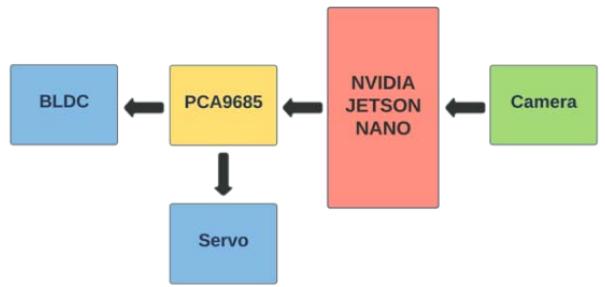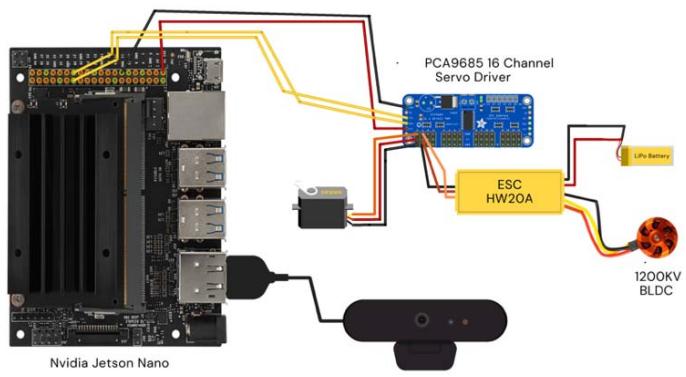 A Nvidia Jetson Nano single-board computer (SBC) serves as both the brain and the communication node in the prototype control system. This SBC receives data from the camera, analyses them, and integrates them into the navigation system to determine the steering angle. A 11.1V - 2200mAh LiPo battery is used solely to power the vehicle's propulsion system, that is, the 1200KV Brushless DC Motor with a 20A ESC. A $180^{\circ}$ rotation servo motor with a torque of $1.2\mathrm{KgCm}$, controlled by the PCA9685 16 Channel Servo Driver, is used to steer the car. Fig. 4 and Fig. 5 show a flowchart of the instruction feedback loop and a schematic diagram of the hardware connections respectively. Fig. 6 shows the entire assembled car.
