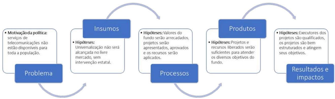 Após analisar o modelo lógico e os indicadores, passemos a identificar e avaliar a teoria do programa, que contempla as premissas, as hipóteses, os mecanismos de mudança, os riscos e o contexto em que a política pública é executada. Nosso objetivo nessa etapa é entender a lógica causal do desenho do Fust e responder se os insumos e processos definidos