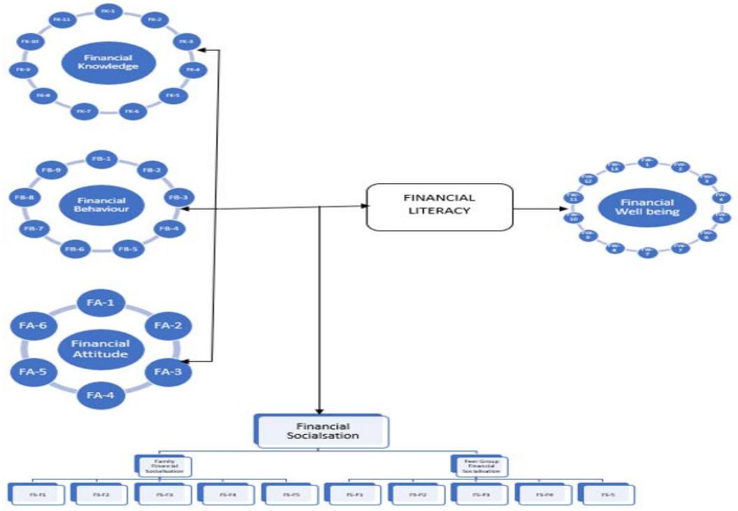 Over the past few years, the world economy has been declining, and the recession has caused inflation, unemployment, and a decline in financial well-being. The decline in financial well-being has harmful effects on mental and physical health. It creates problems of stress, anxiety, depression, and suicide in our society (Taft et al., 2013). Financial literacy has become a much-discussed topic in recent years for the financial empowerment of people and their lives. It catches the attention of a common person who is willing to meet their daily financial needs and plan for a secure future. Financial literacy strengthens people's ability to access financial services, manage their budgets, and maximise resource utilization, which encourages economic development. Financial literacy increases people's confidence and self-control, which encourages their participation in the formal economic system. It will boost your confidence and well-being. As the literature shows, almost all countries in the world are dealing with the issue of financial literacy. But the concept of financial literacy is not yet clear. Different researchers use different definitions of financial literacy. Financial literacy is defined by the OECD (OECD, 2017) as "a combination of understanding, expertise, ability, attitude, and action required to make sound financial decisions and eventually achieve individual well-being". "Financial literacy is the ability to make sound decisions and appropriate choices regarding the use and management of capital" (Huston, 2010)." Financially literate people make good choices about their finances and reduce their risk of being deceived on financial issues" (Beal &Delpachitra, 2003). Financial literacy is affected by the level of education and income of an individual (Nahar et al., 2022) in previous work on financial literacy, researchers used various aspects of financial literacy. Few scholars have used financial literacy and financial knowledge as the same term, while others find financial knowledge is associated with financial literacy and has a high correlation. The OECD has given a detailed view of financial literacy. According to the OECD (2011), "financial literacy is a blend of financial behaviour, financial attitude, and financial awareness," but in this study, researchers added one more determinant to financial literacy, so it is therefore important to gain insight into the association between "financial knowledge, financial attitude, financial behaviour and financial socialisation with financial wellbeing" among the younger generation related to the financial aspects.