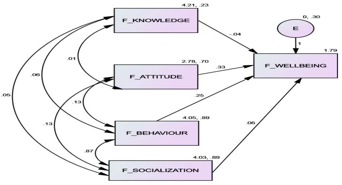 <table><tr><td></td><td></td><td>Estimate</td><td>S.E.</td><td>C.R.</td><td>P</td><td>Label</td></tr><tr><td>F_WELLBEING</td><td><---</td><td>F_KNOWLEDGE</td><td>-.044</td><td>.053</td><td>-.823</td><td>.411</td></tr><tr><td>F_WELLBEING</td><td><---</td><td>F AttITUDE</td><td>.331</td><td>.031</td><td>10.698</td><td>***</td></tr><tr><td>F_WELLBEING</td><td><---</td><td>F_BEHAVIOUR</td><td>.247</td><td>.121</td><td>2.048</td><td>.041</td></tr><tr><td>F_WELLBEING</td><td><---</td><td>F SOCIALIZATION</td><td>.065</td><td>.121</td><td>.537</td><td>.031</td></tr></table>