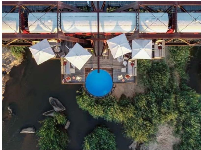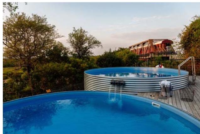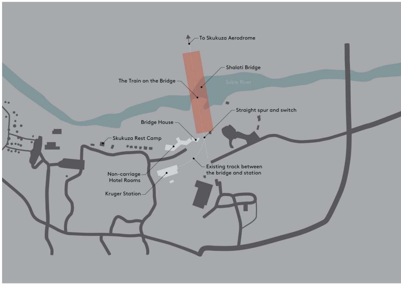 Kruger Shalati: The Train on the Bridge, fully opened in February 2021, comprising 13 carriages on the bridge, with 4 carriages to the south and 8 carriages to the north of the lounge car. Each carriage is divided into 2 luxury rooms. The lounge car is positioned opposite a non-historic water tower, which has been repurposed as the hotel's suspended swimming pool, and is connected to the lounge car with a deck. The KNP has several information centers and Kruger Station serves to provide history on the railway line, the trains, and the bridge. Kruger Station has been repurposed as the park information center, including a $360^{\circ}$ video information wall, public dining facility, and souvenir outlets. "Waterkant", the non-historic lodge accommodation, has been rebuilt as the Bridge House, using a "shed style" to align with the "railway/steel" architectural style. It houses the hotel's reception, indoor/outdoor dining facility with kitchen and double swimming pool. It also incorporates several hotel rooms in separate buildings, that opened in 2022. Finally, a spur and switch were added to the railway to connect it to the Distribution Center, which SANParks allowed the hotel to take over and repurpose as an operation center (for its back-of-house areas), with photovoltaic panels added to its roof. As discussed later, the result differs somewhat from the initial tender proposal. Please refer to Appendix A for a map of Skukuza Rest Camp, Kruger Station, and the Shalati Bridge.