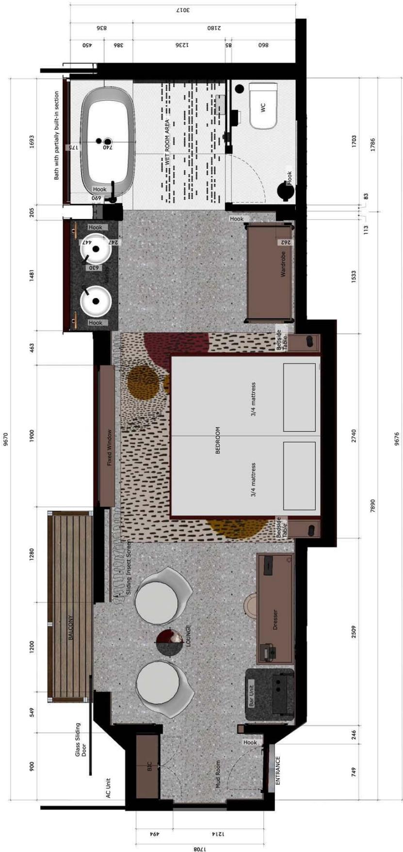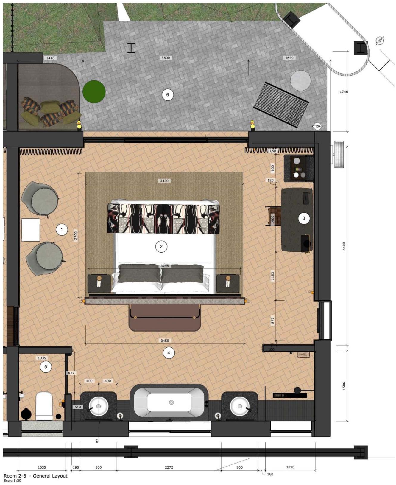 Once the architectural work commenced, the project team recognized that mixing publicly accessible areas (e.g., the park information center, restaurants, and souvenir outlets) with luxury boutique hotel front-of-house areas (e.g., concierge, reception and dining) in the same building was neither desirable, nor workable. An agreement was reached to demolish "Waterkant", the non-historic basic lodge accommodation and rebuild it as the hotel reception and related areas, using a similar building footprint. This allowed for additional space to add six non-carriage hotel rooms and a honeymoon suite within this new Bridge House area, making the hotel concept accessible for prospective guests with acrophobia as well. Please refer to Appendix D for the TOB interior design drawing of a typical non-carriage hotel room.