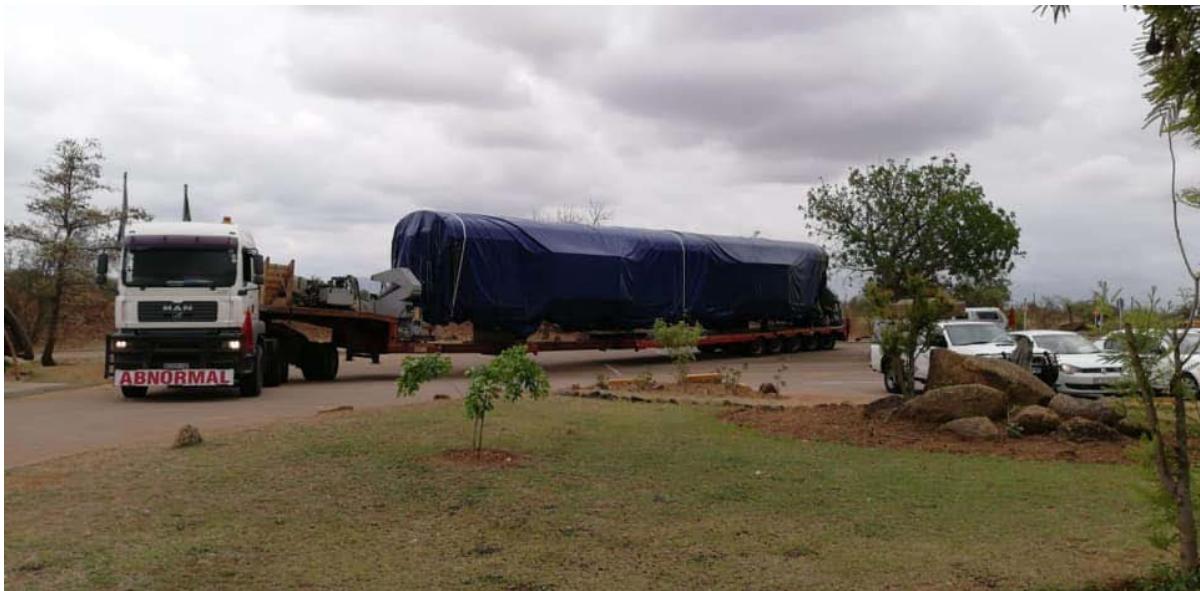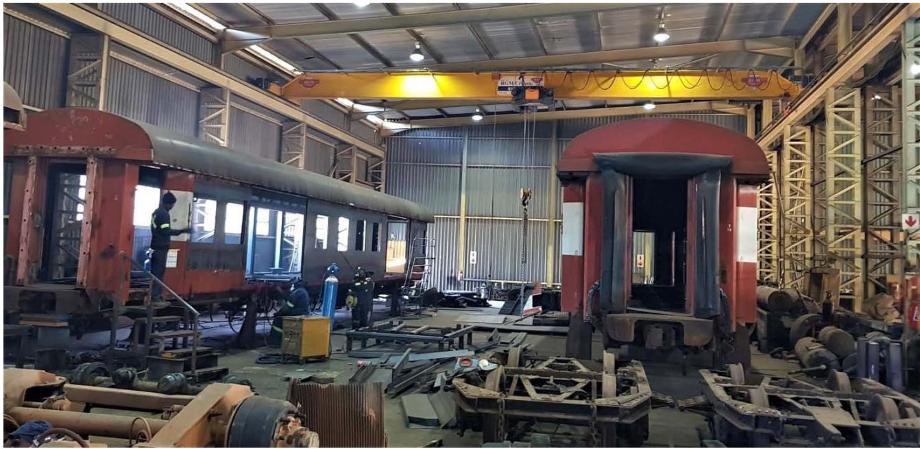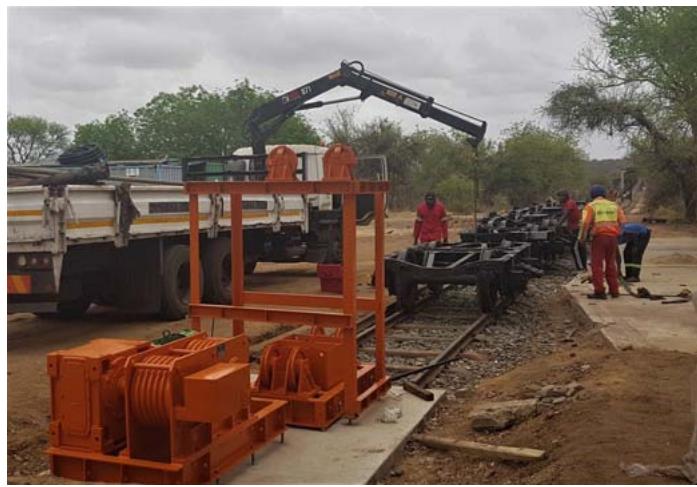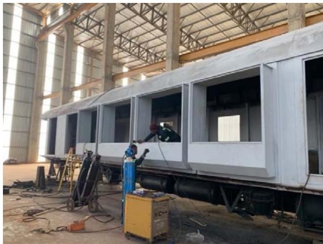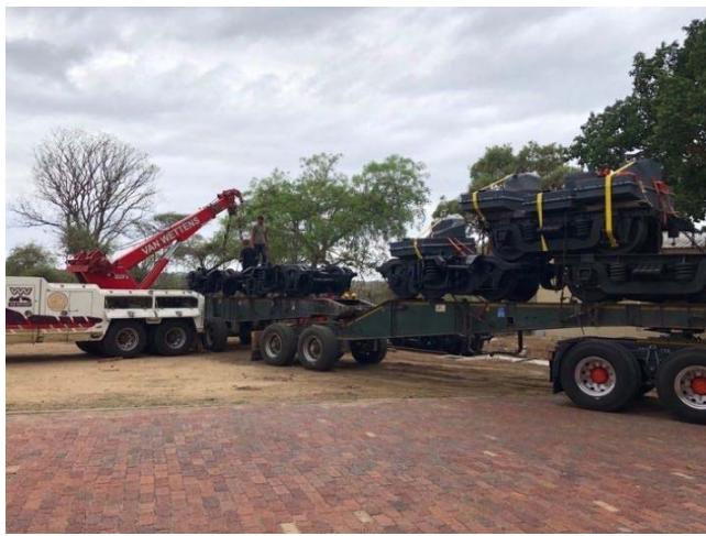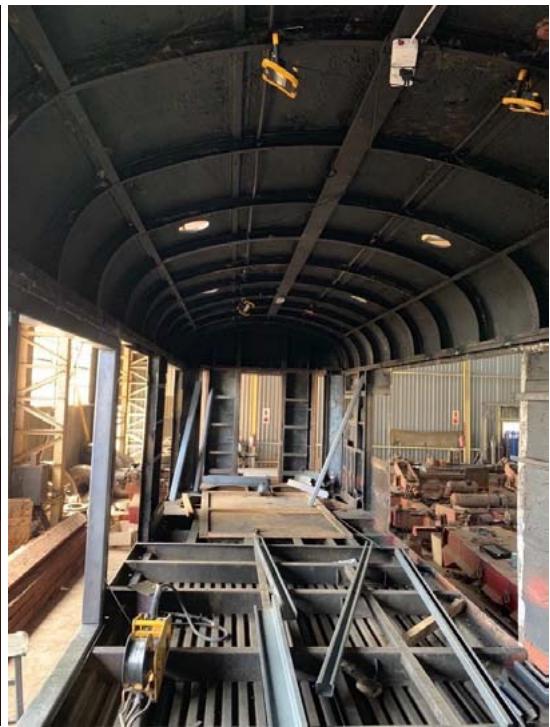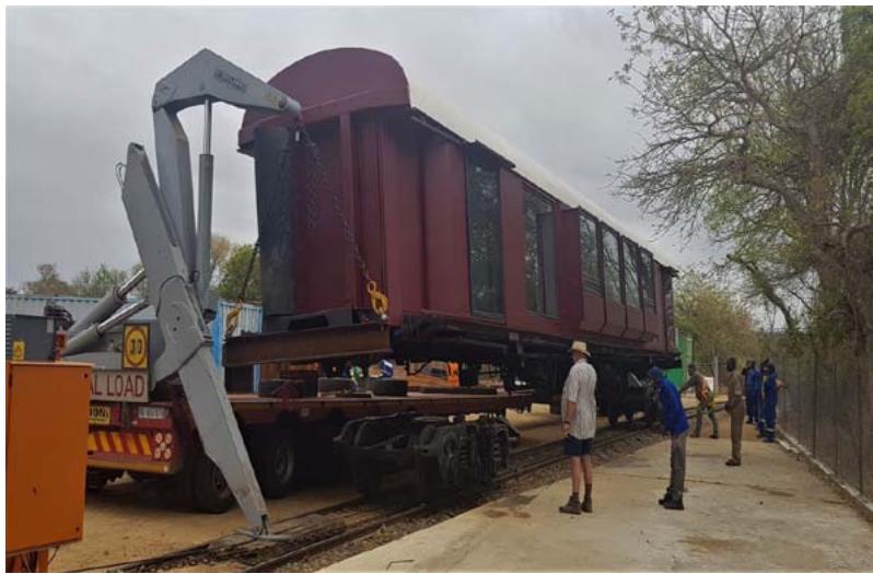 The JV purchased a multi-axle hydraulic low bed trailer with side-lifting, extendable arms from New Zealand to transport the carriages from the shunting yard to the steel workshop, then to the wood workshop and finally to the Shalati Bridge. To lift the carriage on and off the low bed trailer, the train couplings were removed and their center mounting points were adapted to be the lifting points for the cranes.