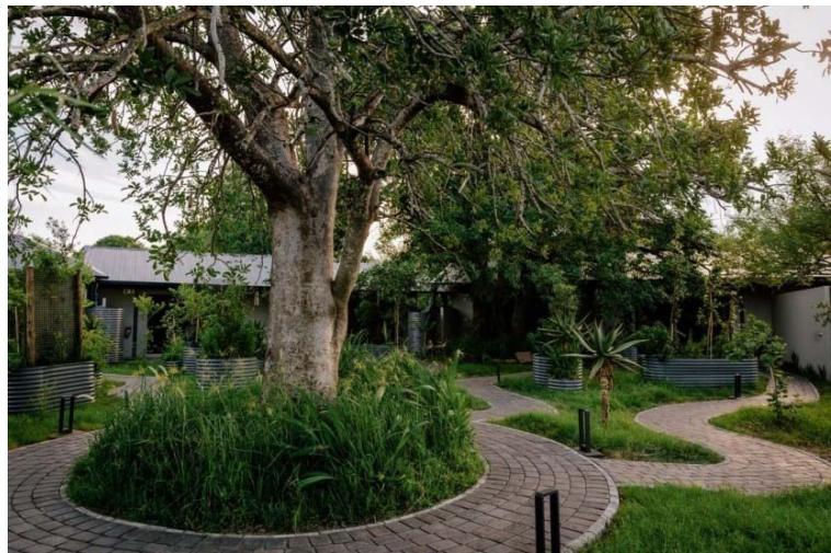 - Bridge House: This facility was built using standard portal frames. This method is widely used in South Africa and was adopted for the design, but to a significantly higher standard of internal fit-out (e.g., the building was extensively insulated for guest comfort). This type of building fits in with the local architectural vernacular very well and it can be built quickly and efficiently. In addition, the semi-skilled labor needed for most of the work is readily available.