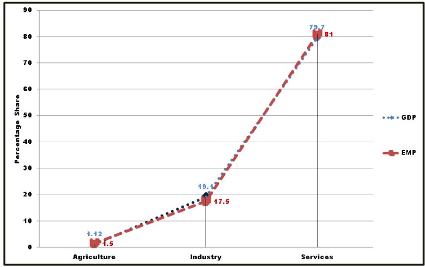 investment in community services (direct services education) not only hampering the qualitative growth and diversification of services like information technology, administrative -services, higher-education, railways, financial, medical except personal services and entertainment; but also putting a downward pressure on the existing ones. Thus, excess population from agriculture can find its way only in personal home care, local transportation, construction-services, salesperson in the shops etc., which are low profile unorganized jobs including information technology enabled services a little bit ahead. This movement from extremely low paid work to semi low paid work: albeit, will equalize the factor prices and GDP: EMP curve will co-inside internally.