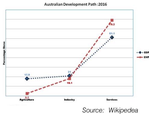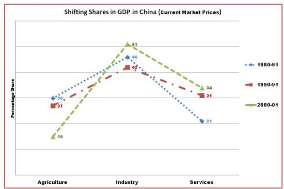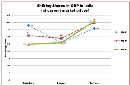 Source: Wikipedia As far as India (Figure: 9) is concerned its industrial sector has reached to its optimum while all other sectors are in transition. Because, India has followed Soviet model of development till 80's that was focused on building a strong industrial and military base to make India self-reliant in coming decades. This public-sector led growth unduly inflated the cost-structure of the economy of India due to long-gestation period. Inflated economy and stringent labor laws further aggravated the problem of unemployment in the coming periods: rising trade deficit, high tariffs, double-digit inflation all led to steep devaluation of Indian currency; Indian foreign exchange-reserves fallen to meet only two and half months import bill: this led Indian economy to pledge its gold reserves to international monetary fund for monetary aid in 1991. IMF imposed conditional aid to overhaul the economy, i.e. switch over to private sector from public sector, liberalize the economy, reduce tariff rates, slash the items reserved only for production in public sector etc. Second wave of economic reforms led to financial liberalization and opened sectors for foreign investment with certain limits. These measures led to GDP growth up-to 5 to 6 percent from earlier 3.5 percent growth. This success on GDP front induced our planners to move on this path and Indian economy moved on export-led growth model. Export- led growth model increased wages of existent laborers and within this structure advent of foreign-capital increased industrial capital: output ratio. External linkage of Indian economy increased and internal weakened due to falling agricultural share and overmanned farming. Industrial sector reached to near saturation in terms of GDP and absorption capacity. From the year 2002 service sector started gaining momentum particularly software industry due to the striking salary differences between developed countries and India. Irrespective of the inward or outward looking strategies of development: focus remained only upon industrial development so that due to higher productivity advantage people can shift from agriculture and further to services from manufacturing for the same reason. But it could not happen; due to lop-sided investment strategy. Lack of quality