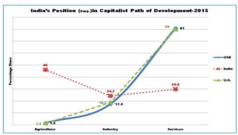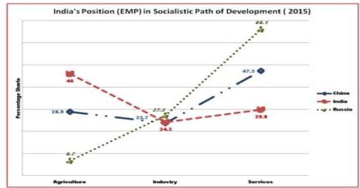 About the economy's employment potential it's major portion of working population still relies on agriculture (46 percent in 2015:) vis a vis capitalist economies (USA, UK) which employs only 2 percent of its population in agriculture (see figure 3). As compared to communist economies they too are moving fast to the services sector and shedding their reliance on agriculture for jobs as soon as diversification of jobs gathered its momentum in these economies. Russia employs less than 10 percent of its population in agriculture while that of China from 50 percent in 2002 to meager 30 percent in 2015 (see Table 1 & Figure 4). Services form a significant proportion of employment in all the above economies ranging from 80, 67,47 and 30 percent in case of USA & UK, Russia, China and India, respectively. So crux of the issue is that India's economic development strategy has committed serious blunders; somewhere, in its formulation.