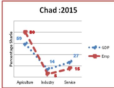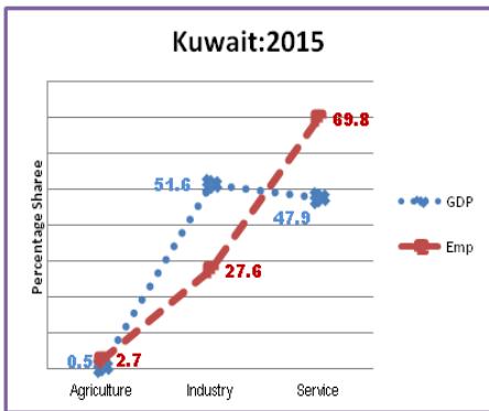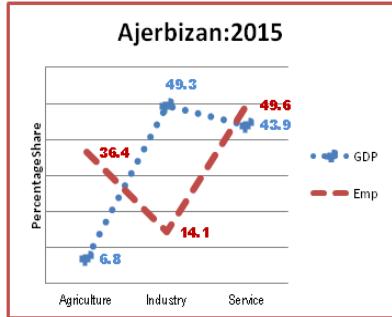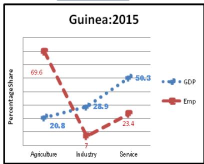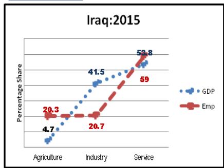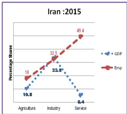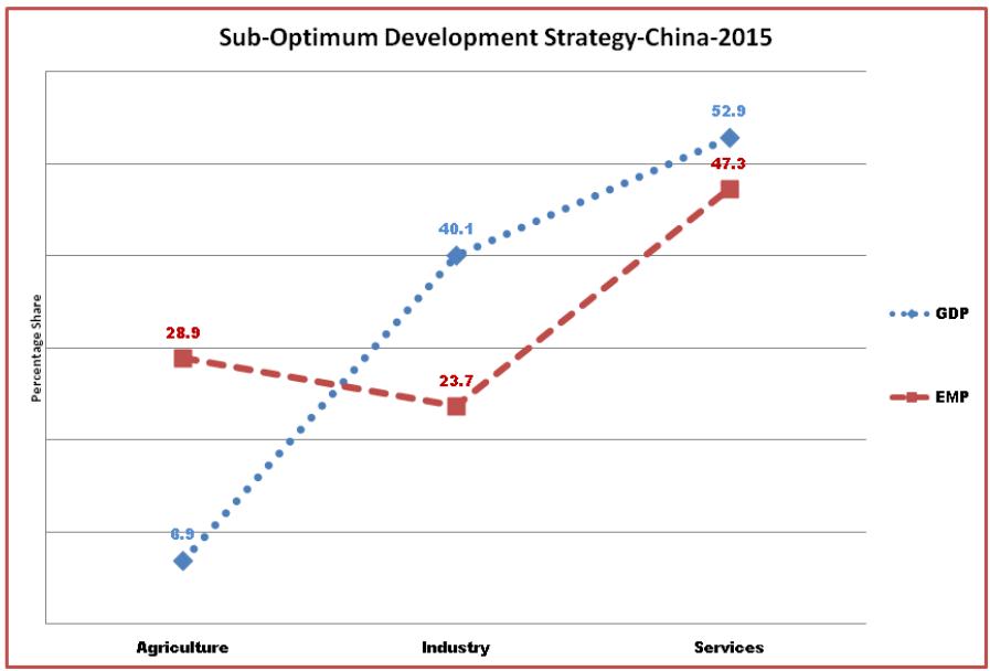 While in figure: 8 China's GDP composition and its employment share has been depicted which clearly shows that Bride or GDP is above the Groom and both are hesitating in hugging each other means male (EMP) should be superior or say employment should be increased in the sectors where GDP $>$ EMP i.e., people will keep on moving from agriculture to Industry and to services until EMP and GDP coincides. So it is suboptimum development strategy in William Alfred Pareto's sense. How this will be done: by expanding manufacturing sector base, so that additional demand