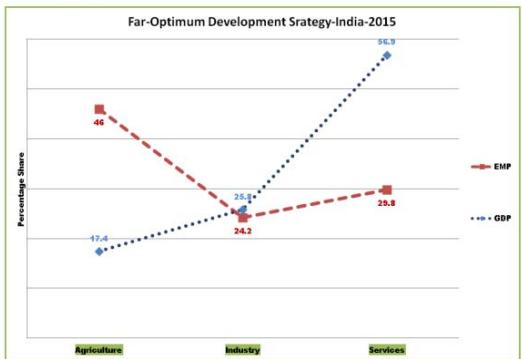 Now what should be the measuring rod for a flawless development strategy? I will start with the connotation that Economy is by the population, for the population and of the population. The objective of every economy should be its people's growth not the economy's growth. So the best development strategy would be when its [Employment Share/Sectoral Share] to GDP ratios becomes one, i.e. when both the curves co-insides (within a maximum time span of 100 years) and factors mobility within the economy apparently comes to an end: as factor price equalization theorem (Heckscher-Ohlin Factor Price Equalization Theorem) emphasizes. Until (average) value of the marginal physical product of labor $(\text{VMP}: = \text{MPPL}^* \text{AR} = \text{P})$ in all sectors doesn't become equal: factors of production will keep on moving from one productive activity to another. Clearly, the sectors which have higher marginal physical product will employ more people herein lies the rationale of service sector's growth potential. But service sector's growth should be potent instead concentration of migrants (from agriculture and retrenchment).