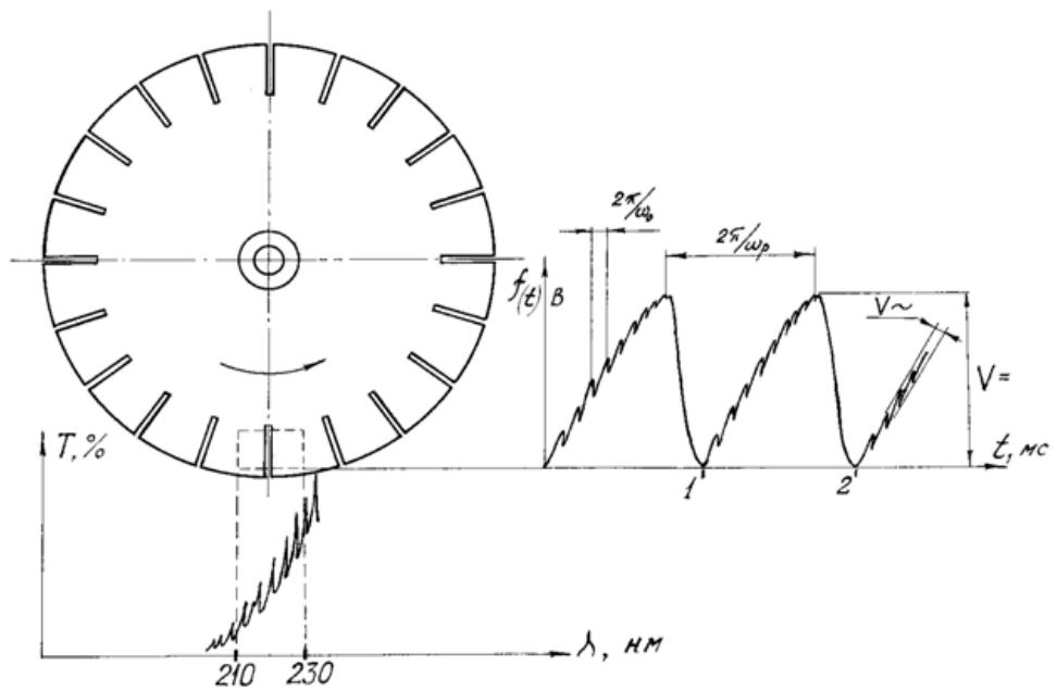Електронни смуги поглинання, наприклад, ${ \mathsf { S O } } _ { 2 }$ мають яскраво виражену характерну коливальну структуру (див.рис.1). Тому y вихідний площини полихроматора, при наявности в робочий кюветі ${ \mathsf { S O } } _ { 2 }$ буде спостеригатися спектр ${ \mathsf { S O } } _ { 2 }$ у вигляді "свитлих" "темних що чергуються (B максимумах поглинання спектру випроминювання послаблюсться, в мінимумах - залишається 6e3 істотних 3мін).При скануванні цього спектру 3 частотою ω p $\omega _ { p }$ 3a допомогою, наприклад, наризаних на обертовому диску радіальних вихідних щілин (число щілин вибирається з умови, щоб у зони сканування в кожний момент часу знаходилася Тільки одна щілина), Ha виХоді фотоприймача (фотоелектронного помножувача - ФЕП) з'являсться електричний сигнал з певною "резонансною" длЯ ${ \mathsf { S O } } _ { 2 }$ частотою $\omega _ { o }$.Амплитуда цього електричного сигналу пропорцийна концентрації ${ \mathsf { S O } } _ { 2 }$.