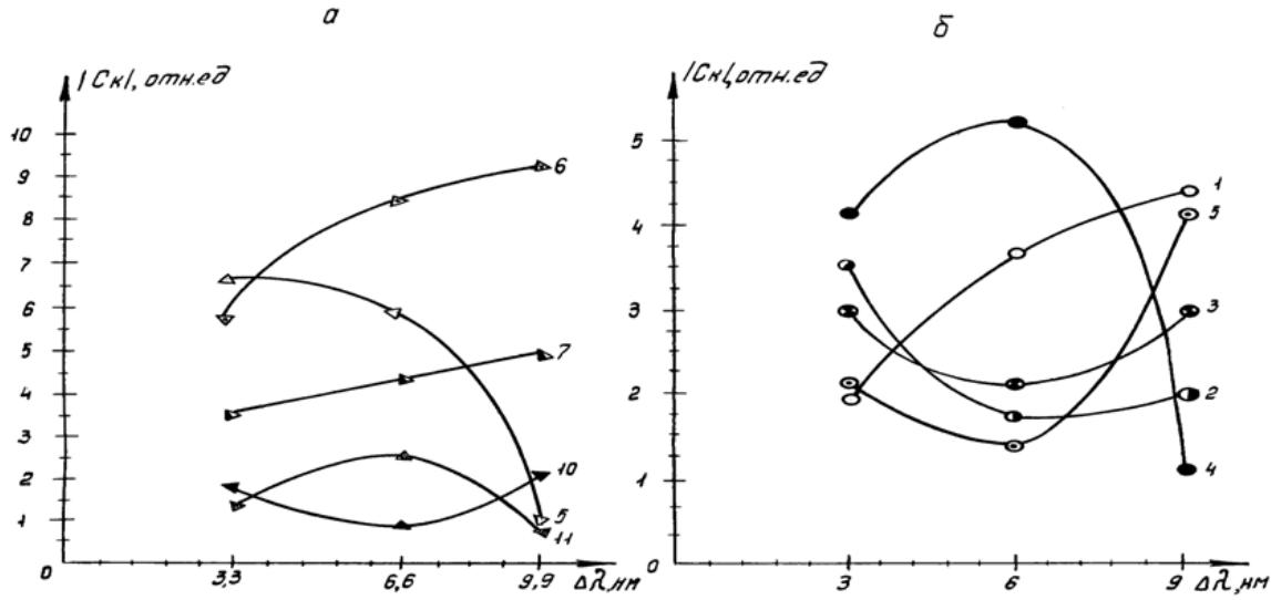3. Як бачимо, при збильшенні ширини щілин величина корисного сигналу (6-ої гармоники) збільшусться. Збільшується i відношення амплитуд гармоник $/ C _ { \theta } / / / C _ { \ I } /$ величина $[ / C _ { \delta } / - ( / C _ { \delta } / + / \bar { C } _ { 7 } / ) / 2 ] / / C _ { 1 }$ /. тобто корисний сигнал з врахуванням фонової складовой, виднесеной до основной гармоники частоти сканування.