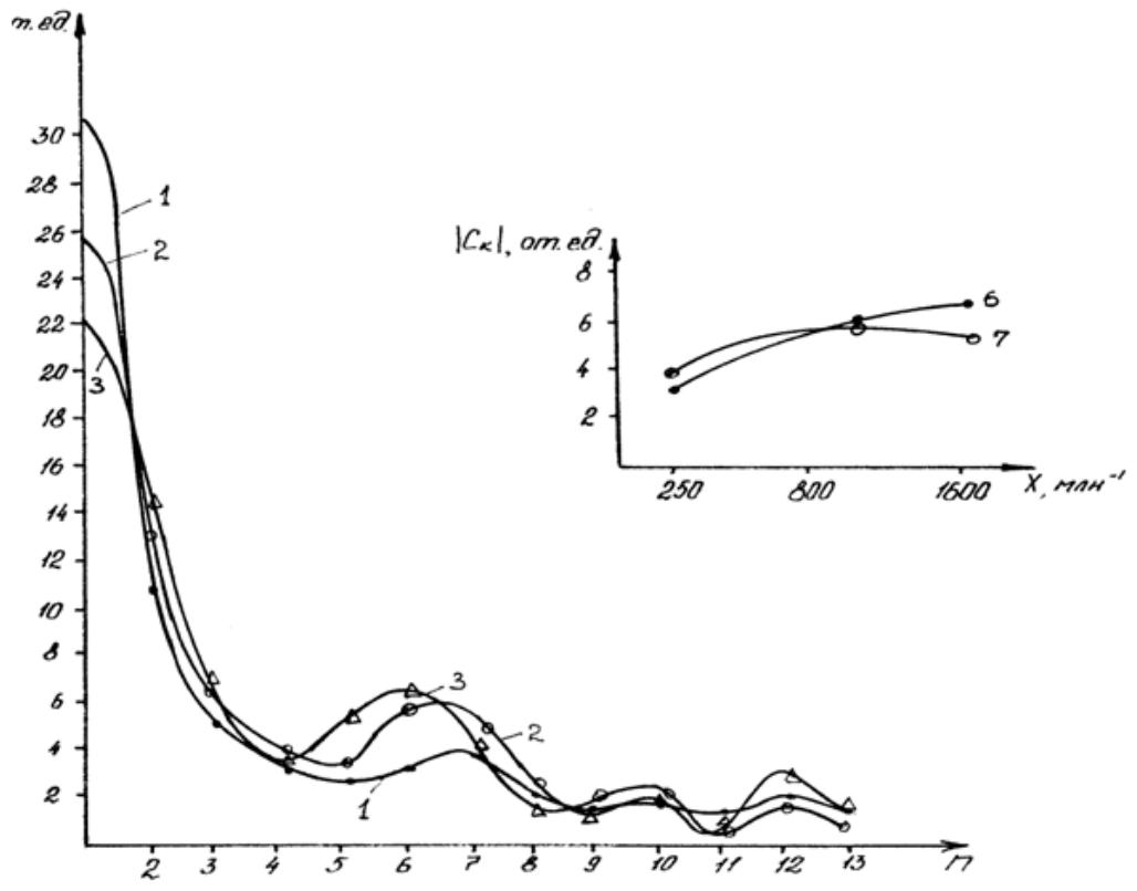 Змина гармоничного складу корисного сигналу при збильшенни концентраций дослиджуваного газу. В газову кювету послідовно напускались концентрації ${ \mathsf { N H } } _ { 3 }$ $\pmb { \chi _ { \eta } } = 250 \ \mathbf { M } \mathbf { I H } ^ { - 1 }$, $\pmb { \chi _ { 2 } } = 800 \ \mathbf { \mathrm { u J I H } } ^ { - 1 }$, $\chi _ { \ 3 } = 1600 ~ \mathrm { M J H } ^ { - }$ 1. Для кожного значення концентрацій знимався спектр у диапазоні довжин хвиль вид 190 до 230 нм i за допомогою перетворення Фур'с визначався гармонічний склад корисного сигналу. Результати експерименту наведено на рис.