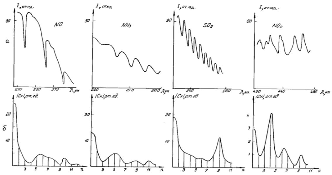 На рис.2 наведені ділянки спектрив NoО, ${ \mathsf { N H } } _ { 3 }$, ${ \mathsf { S O } } _ { 2 }$ в области 200-230 нм i ${ \mathsf { N O } } _ { 2 }$ в області 430-450 нм. Як бачимо, спектри мають характерну структуру. Ділянки спектрів NoО, ${ \mathsf { S O } } _ { 2 }$, ${ \mathsf { N H } } _ { 3 }$ знаходяться на краю інтенсивних електронних смуг поглинання, тому інтегральне поглинання значно Змінюється 3i зменшенням довжини хвилі. Одержані в результаті розрахунків гармонични склади часових сигналів, що знимаються з фотоприймача при скануванні, наведені на рис.2.а, ділянки видповидних спектрив зображені на рис. 2.6. Отримані розрахункові залежности перевiряliся експериментально 3a допомогою скануючого з великою ${ \pmb { \omega } } _ { o }$ ділянки (наприклад, ${ \mathsf { N H } } _ { 3 }$, ${ \mathsf { S O } } _ { 2 } )$ у спектри електричного сигналу присутни дві основни гармоники - перша видповідає частоті $\omega _ { p }$ i друга (n-Ta) - $\pmb { \omega } _ { o }$,де п - кількисть линий поглинання на сканований ділянці спектру. Так, при скануванни ділянки спектру ${ \mathsf { N H } } _ { 3 }$ 200-220 нм частота $\pmb { \omega } _ { o }$ відповiдає п'ятій гармониці, i дев'ятий гармоніці $( n = 9 )$ при скануванни ділянки $210 \small { - } 225 \ \mathbf { \Sigma } _ { \mathrm { H M } }$ ${ \mathsf { S O } } _ { 2 }$.Якщо ж сканусться не ціле число периодів структури спектру, наприклад $n = 4 {, } 5$, то інтенсивними є 4 i 5 гармоники спектру електричного сигналу.