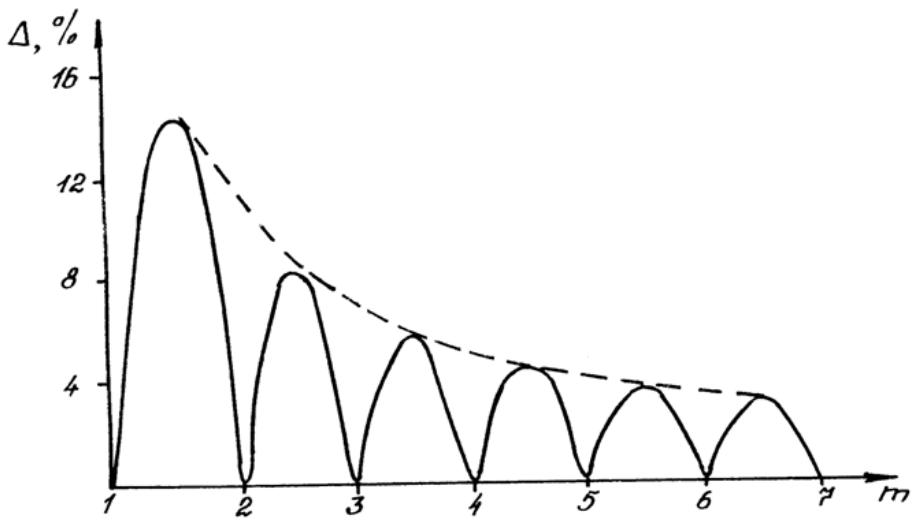 Звичайно, зі збильшенням числа т видносний внесок нецілих частин Д зменшусться. На рис. 7 показана теоретична залежнисть відносной змини корисного сигналу при зсуви спектру дослиджуваного газу в площини вихидної щілини в залежности вид т. Як бачимо, зменшення при збільшенни т спочатку видбувасться досить швидко, а далі ця змина насичусться.