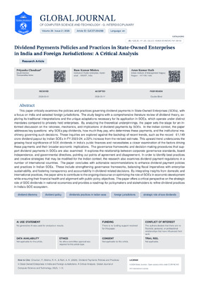 Miss Priyanka Chouhan. 2026. \u201cDividend Payments Policies and Practices in State-Owned Enterprises in India and Foreign Jurisdictions: A Critical Analysis\u201d. Global Journal of Computer Science and Technology, Global Journal of Computer Science and Technology - G: Interdisciplinary GJCST-G Volume 26 (GJCST Volume 26 Issue G2): .