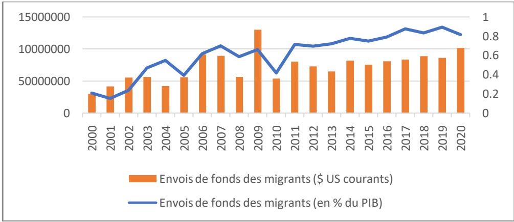 Figure 2: Evolution des envois de fonds des migrants au Cameroun sur la période 2000-2020
