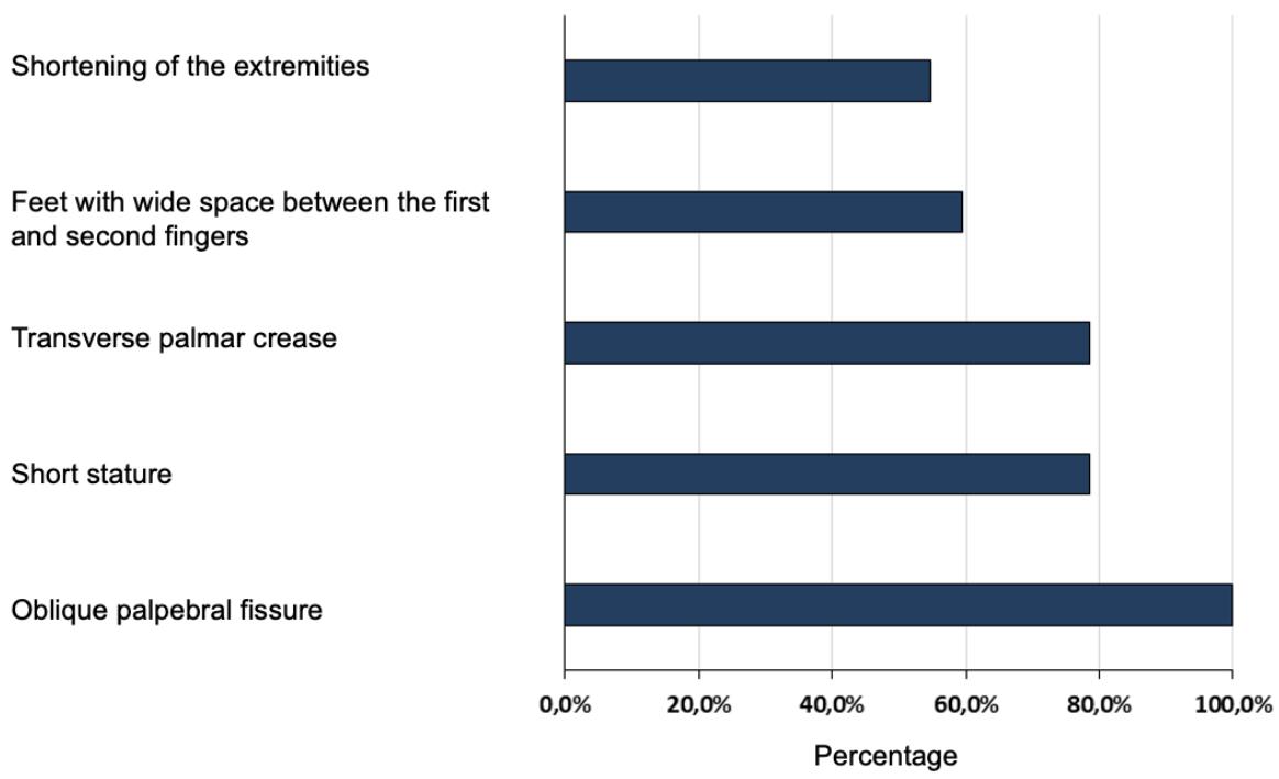 In Figure 1 it can be seen that all participants have an oblique palpebral fissure (100.0%) and the majority have short stature (78.6%), a single transverse palmar crease (78.6%), feet with wide space between the first and second fingers (59.5%) and shortening of the extremities (hands, feet, fingers, nose and ears) (54.8%).