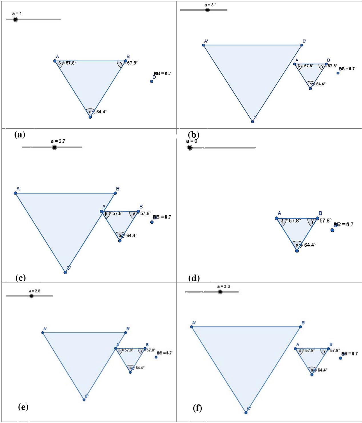 In this article, we illustrated (prospective) teachers interacting in VMTwG in activities concerning triangle similitude. In the illustrated episode – from the measures of the sides and the calculus of the ratios with the calculator – the participants constructed the conjecture of the proportion of the corresponding sides. Using of the sliding control enabled us to explore approaches, inferences on measures and the notion of ratio as fraction, the analysis of global and cases ( $a = 1$ and $a = 0$ ). The processes involved in the use of sliding control can assume a more potent form, as they allow not only global observation, but also the checking. The types of flow of thought identified were ascending and descending and encouraged exploration, building conjectures, and intentionally checking their suppositions. Further research needs to be done using sliding control with different numerical intervals.