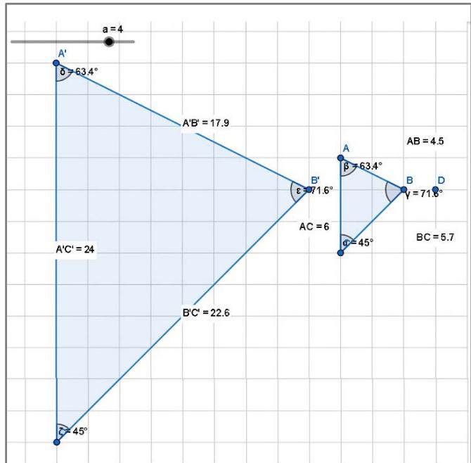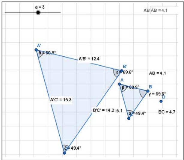 The participants questioned the mediating teacher (second author) about a problem with the entrance box for the GeoGebra commands and were oriented to use the calculator in their computers to obtain the ratio between the corresponding sides. The final configuration in the Graphic zone at that instant in the task is shown in Figure 1.