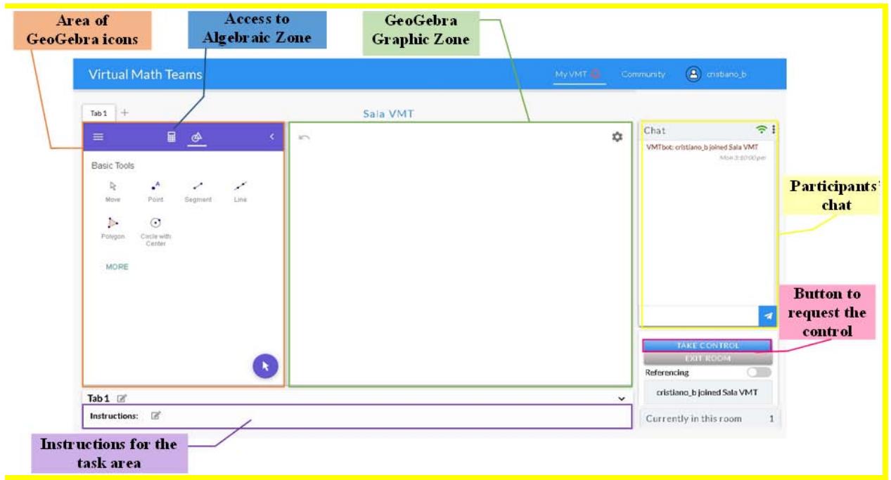 Those features can be enhanced by making groups of interaction in virtual environments, working on the resolution of mathematic tasks in a collaborative way (Powell, 2014). It was with this aim that VTM was developed, so that participants could interact with one another through a chat, build figures and drag points in the graphic area of GeoGebra.