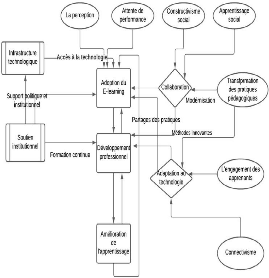 Dans le cadre de cette étude, nous avons élaboré un cadre théorique conceptuel pour comprendre les dynamiques du développement professionnel des enseignants universitaires à travers le e-learning. Ce cadre, représenté dans la Figure 1, illustre les différentes composantes théoriques qui soustendent notre analyse.