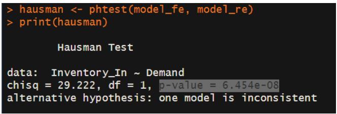 were tested, and the Hausman test was conducted to determine the most appropriate model. The objective was to assess the degree to which inventory inflows align with demand variations by product, warehouse, and time period. The analysis was performed using R version 4.5.1.