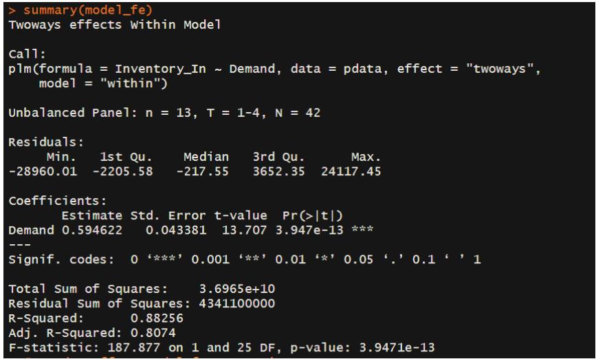 With an R squared of 0.88256, this shows that $88\%$ of the variation in the inventory inflow is explained by the model. The F-statistic of 187.877 and p-value less than 0.05 indicates a statistical significance model overall. So, each unit increase in demand leads to approximately 0.6 unit increase in inventory inflow. The model suggests a strong and statistically significant relationship between demand and inventory received with consistency across panels.