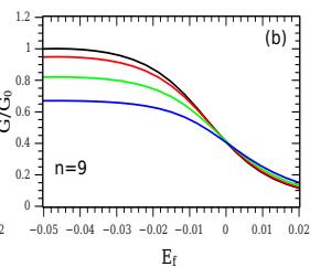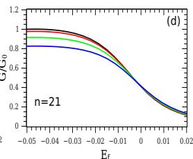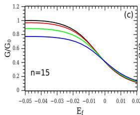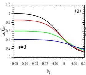 Fig. 6: Conduitance as a function $E_{f}$ (multiplied by $\Delta = 0.01$ ) for different values of hopping $t = 0.0V$ (black line); $t = 0.5V$ (red line); $t = 1.0V$ (green line) and $t = 1.5V$ (blue line), with $T = 0.001\Delta$ and for different values of $n$.