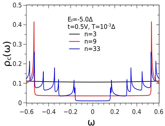 Fig. 2: The density of states of the conduction electrons $\rho_{c}$ as a function of the $\omega$ (multiplied by $\Delta = 0.01$ ) and for $n = 3$, $n = 9$ e $n = 33$.