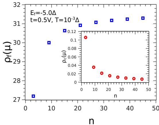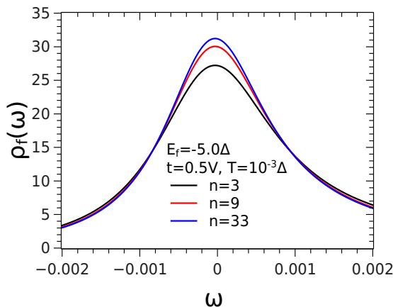 Fig. 4: The density of states of the localized $f$ level $\rho_f$ at the chemical potential $\mu = 0$ as a function of $n$, for $E_f = -5.0\Delta$, $t = 0.5V$ and $T = 0.001\Delta$.