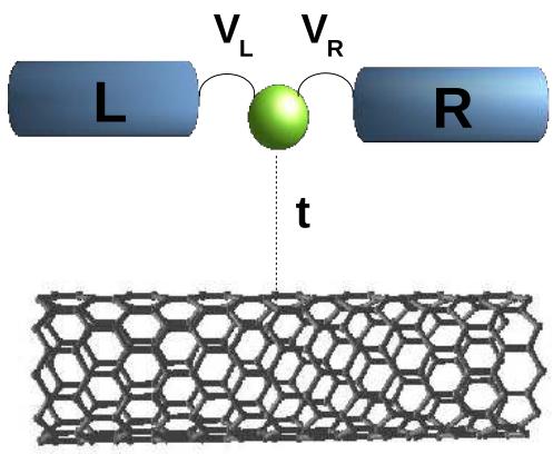 Fig. 1: Quantum dot adsorbed in a ballistic channel laterally coupled to a carbon nanotube