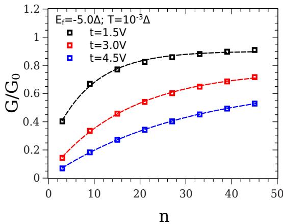Fig. 7: Conductance as a function $n$ for different values $t$. $E_{f} = -5.0\Delta$ and $T = 0.001\Delta$