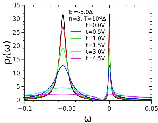 In Fig. 5 we present the density of states of the felectrons localized at the QD for different values of $t$, which is the hopping between the nanotube and the QD, keeping all other parameters constant and for $n = 3$.