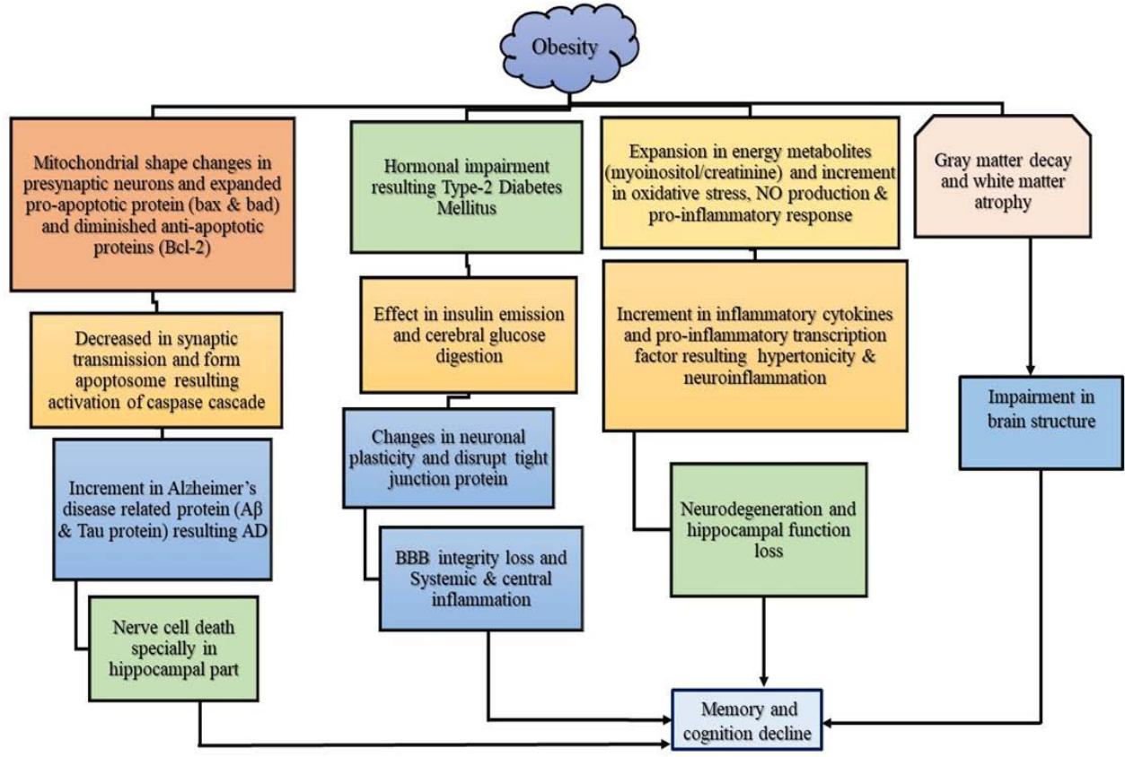 BBB is mainly made up of endothelial cells. However, obesity is a cause of endothelial brokenness, adding to BBB deterioration through some mechanisms (Wardlaw et al., 2013). This results obesity-related cognitive impairments, initiates neuroinflammation and neurodegeneration. Disturbance in the tight junction of endothelium breakdown the BBB (Zlokovic, 2008) proposes that obesity might trigger tight junction interruption prompting BBB breakdown. The disruption of BBB by lipid-like substances results in microglial activation, decreased endothelial tight junction and protein articulation (Shigemoto-Mogami, Hoshikawa, & Sato, 2018; Sumi et al., 2010), ultimately leading to persistence neuroinflammation (Dalvi et al., 2017; Thaler et al., 2012) and cognitive dysfunction (Kahn & Flier, 2000). In like manner, (Bocarsly et al., 2015) announced that obesity prompted decreases in dendritic spines and led to cognitive decline. It has been shown from different findings that obesity is associated with systemic and central inflammation (Gregor & Hotamisligil, 2011; Miller & Spencer, 2014) and is always hindering memory and cognition by stimulating the production of pro-inflammatory cytokines and adipokines that lead to insulin resistance (Su et al., 2017). De Souza and partners found that high-fat diets or obesity raises the pro-inflammatory cytokines and the pro-inflammatory transcription factor NF $\beta$ B in the hypothalamus (De Souza et al., 2005). The hippocampus, a significant area in cognitive preparing, learning, and memory, might be especially defenseless against inflammation in obesity, with raised TNF- $\alpha$ and ionized calcium-binding connector particle 1 (Iba1; microglial marker) (Jeon et al., 2012). Hence, this concluded that systemic inflammation and obesity have been recognized as the leading cause of cerebral white matter injuries and cognitive brokenness (T Den Heijer et al., 2005; Viscogliosi, Donfrancesco, Palmieri, & Giampaoli, 2017). In addition, higher plasma levels of interleukin (IL)-12 and 6 are connected to diminished speed in handling data and a quicker pace of cognitive decay (Marioni et al., 2010; Schram et al., 2007; Trollor et al., 2012). Hypertension expands one's danger of being diagnosed to have mild cognitive impairment (MCI) (Reitz, Tang, Manly, Mayeux, & Luchsinger, 2007). It predicts the degree of weakness seen in these people (Goldstein, Levey, & Steenland, 2013). Obesity-induced hypertension in midlife is conversely identified with execution on an assortment of cognitive tests, for example, those verbal surveying memory and executive function during obesity (M. Elias, Elias, Sullivan, Wolf, & D'agostino, 2003; Launer, Masaki, Petrovitch, Foley, & Havlik, 1995). Past research has shown that mitochondria assume a crucial part in cerebrum synaptic transmission and age-related intellectual capacity (A. Cheng, Hou, & Mattson, 2010; Hara et al., 2014; Mattson, Gleichmann, & Cheng, 2008; Raefsky & Mattson, 2017). That study suggested that changes in the shape of mitochondria in presynaptic neurons affected synaptic transmission. Additionally, apoptosomes are formed that activate the caspase cascades and subsequently trigger cell death(Cain, Bratton, & Cohen, 2002). Research has shown increased level of pro-apoptotic proteins (Bax and Bad) in brain tissue from rodents with insulin resistance caused by mitochondrial impairment, along with reduced levels of anti-apoptotic proteins (Bcl-2) (Nuzzo et al., 2015; Sa-Nguanmoo et al., 2017; Sa-Nguanmoo et al., 2016). An increment in pro-apoptotic proteins can prompt cytochrome C release, bringing about cerebrum apoptosis (Gómez-Crisóstomo, López-Marure, Zapata, Zazueta, & Martínez-Abundis, 2013). Also, apoptotic-mediated neuronal passing has been known to be one fundamental component for intellectual weakness and other neurodegenerative infections and cognitive loss (Ghavami et al., 2014).