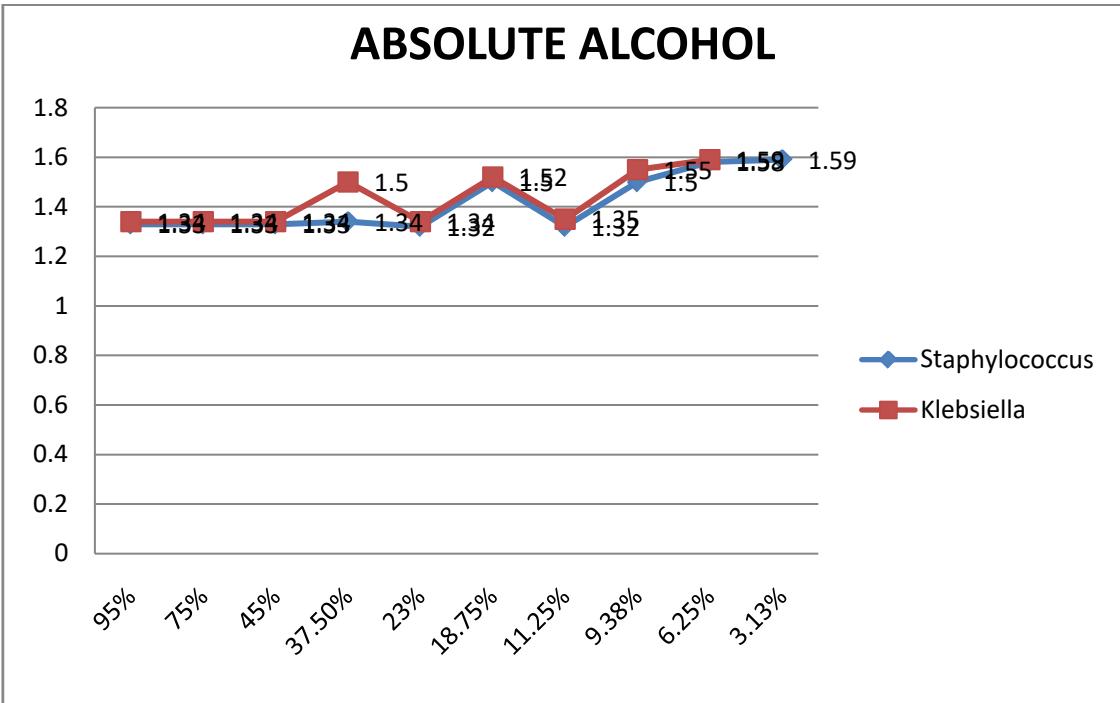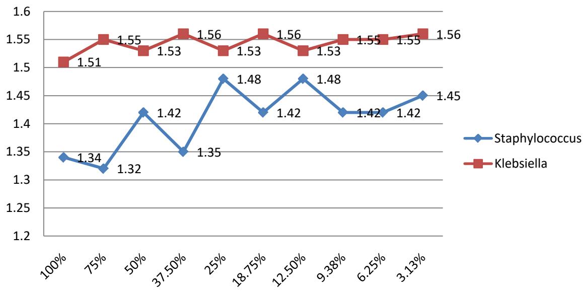 Based on extract with absolute alcohol the concentration with $95\%$ stocks were bactericidal on Staphylococcus and Klebsiella and with stocks of $75\%$