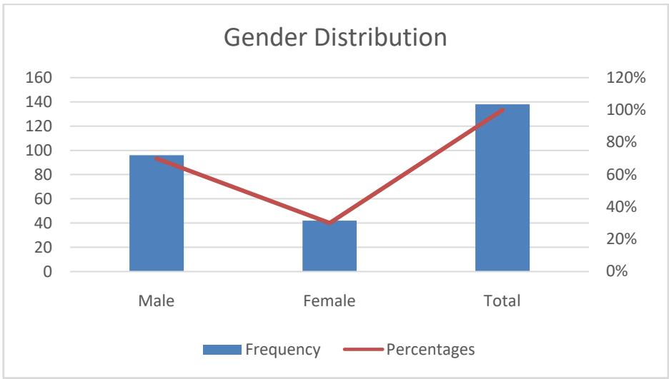 <table><tr><td>Gender</td><td>Frequency</td><td>Percentages</td></tr><tr><td>Male</td><td>96</td><td>70%</td></tr><tr><td>Female</td><td>42</td><td>30%</td></tr><tr><td>Total</td><td>138</td><td>100%</td></tr></table>