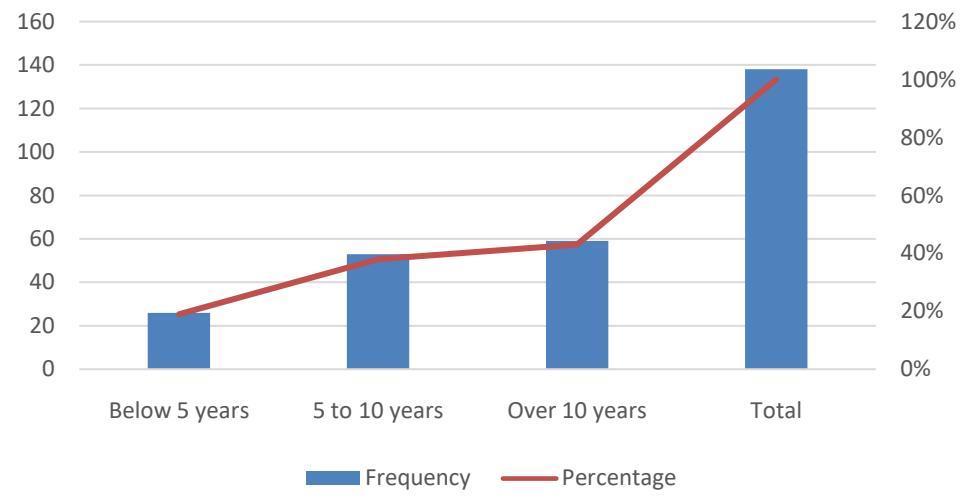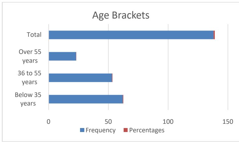 <table><tr><td>Age Groups</td><td>Frequency</td><td>Percentages</td></tr><tr><td>Below 35 years</td><td>62</td><td>45%</td></tr><tr><td>36 to 55 years</td><td>53</td><td>38%</td></tr><tr><td>Over 55 years</td><td>23</td><td>17%</td></tr><tr><td>Total</td><td>138</td><td>100%</td></tr><tr><td>Mean Age group</td><td>46</td><td></td></tr><tr><td>Standard Deviation</td><td>20.42058</td><td></td></tr></table>