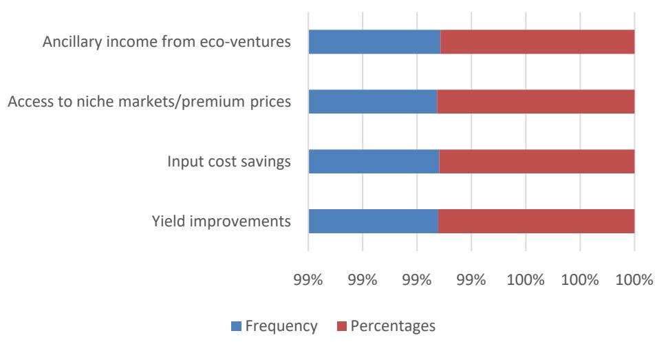 agricultural integration and farm budget levels reflecting accrued income gains over time (Wainaina et al., 2021). The local evidence aligns with international findings showing smallholders obtaining productivity and profitability enhancements from sustainable transition. Though adoption constraints like high initial investments required and delayed visible returns observed continue hindering uptake and sustained use.