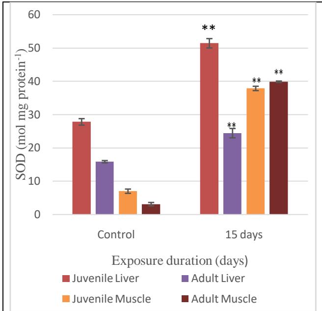 The results of the SOD activity (mean $\pm$ SD) are presented in Fig. 7. All the values increased and are highly significant when compared with the control data. The liver and muscle of the juvenile fish were analysed and found to exhibit increase at $15^{\text{th}}$ day of exposure. In the case of the adults, the liver and muscle showed trend in the SOD levels similar to that in the juveniles.