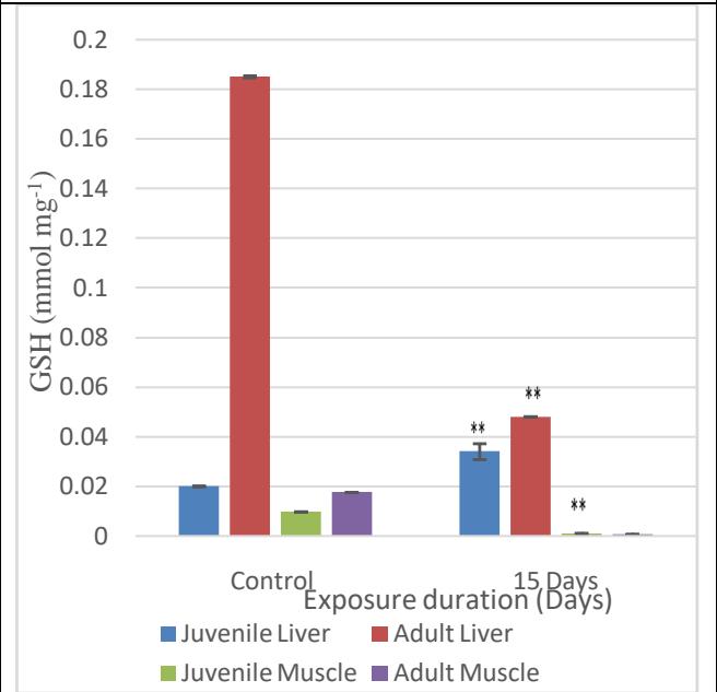 GSH was observed to be 0.02 mmol $\mathrm{mg}^{-1}$ tissue in the liver of juveniles and 0.185 mmol $\mathrm{mg}^{-1}$ in the adult liver at the start of the experiment. With the increase in the duration of exposure to 15 days, GSH levels in the juvenile liver increased, whereas in the adult liver, it decreased. The change in the values is significant ( $p<0.01$ ) when compared to the control. The GSH content in the muscles of the juvenile fish in the control group was found to be 0.00974 mmol $\mathrm{mg}^{-1}$ tissue weight and in the mature fish, the value was 0.0178 mmol $\mathrm{mg}^{-1}$ (Fig. 10). The values decreased in the case of both mature and juvenile fish with significant values ( $p<0.01$ ) and ( $p<0.001$ ), respectively.