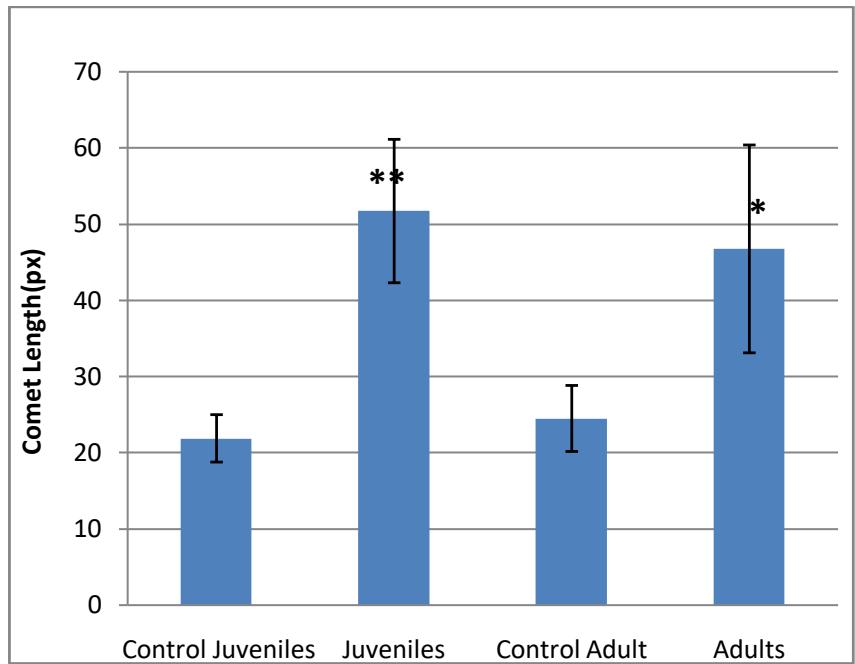 Fig. 2: Comet length in px(mean±SD) obtained in juvenile and adult test fish (\*\*p< 0.001)