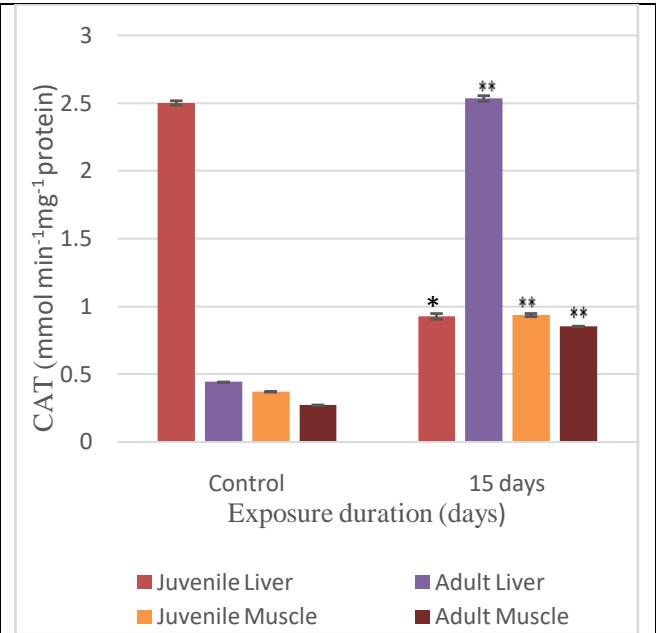 The juvenile liver showed a decrease in activity after 15 days of exposure in comparison with the control values. In the adult liver, activity is significantly increased when compared to the control. The adult muscle showed an increase over the entire time of exposure similar to that seen in the adult liver. After 15 days of exposure, the values kept increasing in both juvenile and adult muscle (Fig. 8). All the values are significant $(p < 0.01)$ with all tissues other than juvenile liver showing increase in the values at 15 days of exposure.