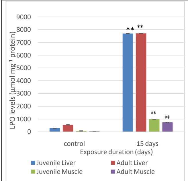 The quantity of MDA (measured as TBARS) formed in the control liver of the juvenile fish was analysed to be at $276.97 \mu \mathrm{mol} \, \mathrm{mg}^{-1}$ protein and in the mature liver, it was $541.33 \mu \mathrm{mol} \, \mathrm{mg}^{-1}$ protein. The formation of TBARS increased in both the juvenile and adult fish liver. The juvenile liver had the value at 7706.7 $\mu \mathrm{mol} \, \mathrm{mg}^{-1}$ on day 15, whereas in adult liver it increased to $7719.9 \mu \mathrm{mol} \, \mathrm{mg}^{-1}$ protein on day 15. The same was the case with the muscles from both the groups showing increase in the levels of TBARS formed; from values of $66.73 \mu \mathrm{mol} \, \mathrm{mg}^{-1}$ protein to $990 \mu \mathrm{mol} \, \mathrm{mg}^{-1}$ protein in juvenile muscle and $33.28 \mu \mathrm{mol} \, \mathrm{mg}^{-1}$ protein to $729.30 \mu \mathrm{mol} \, \mathrm{mg}^{-1}$ protein in adult muscle (Fig. 9). All the values obtained for TBARS are highly significant ( $p<0.01$ ) when compared to the control values and showed an increase which means the rate of lipid peroxidation also increased during exposure.