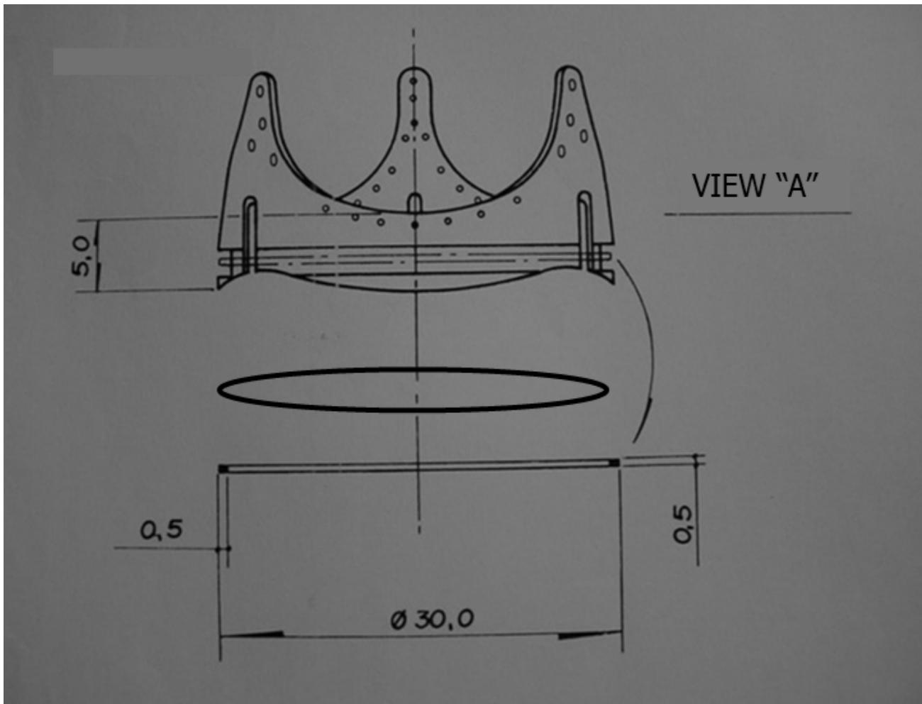 Figure 1: VIEW "A": drawing in millimeters of the sinuous support for the bioprosthesis with the interchangeable framework in the front view and the ring that holds the sewing ring in the oblique view and the front view.